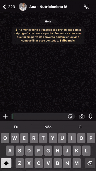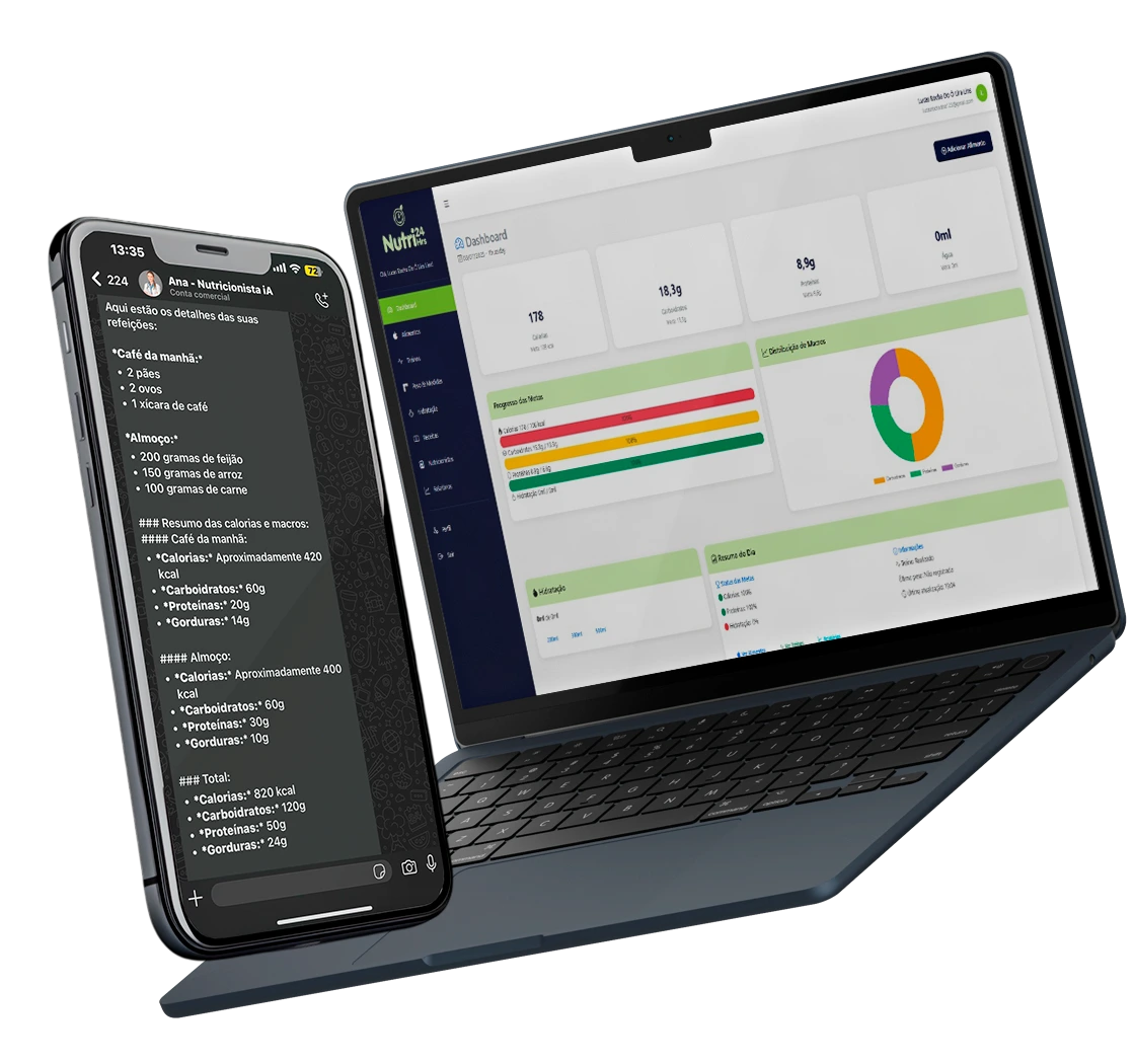 Esqueça as contas e as adivinhações. Basta conversar com nossa IA no WhatsApp. Ela calcula suas necessidades de calorias, proteínas e carboidratos em tempo real, com base nos seus objetivos (perder peso, ganhar massa, manter).